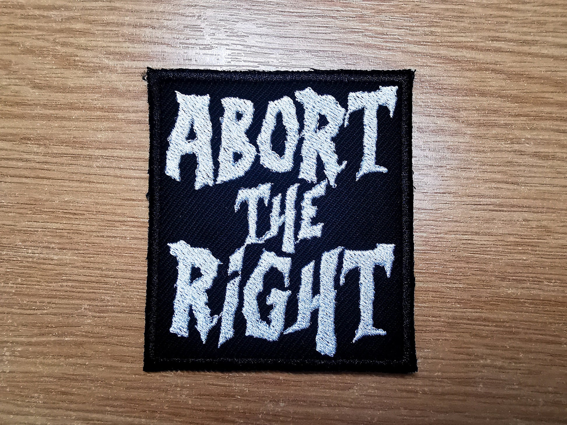 A close-to-square patch with a metal/punk stylie writing of "Abort the Right".