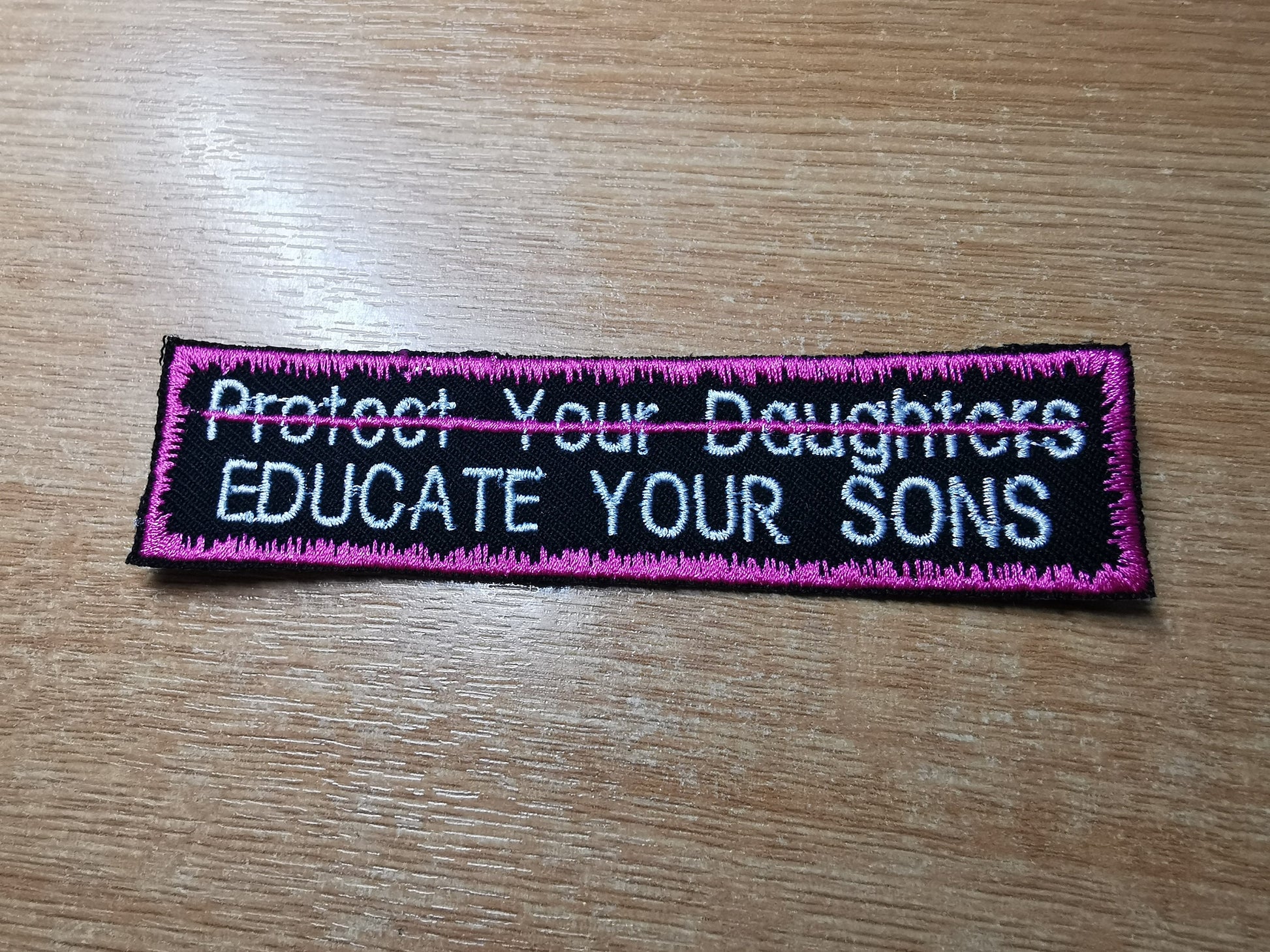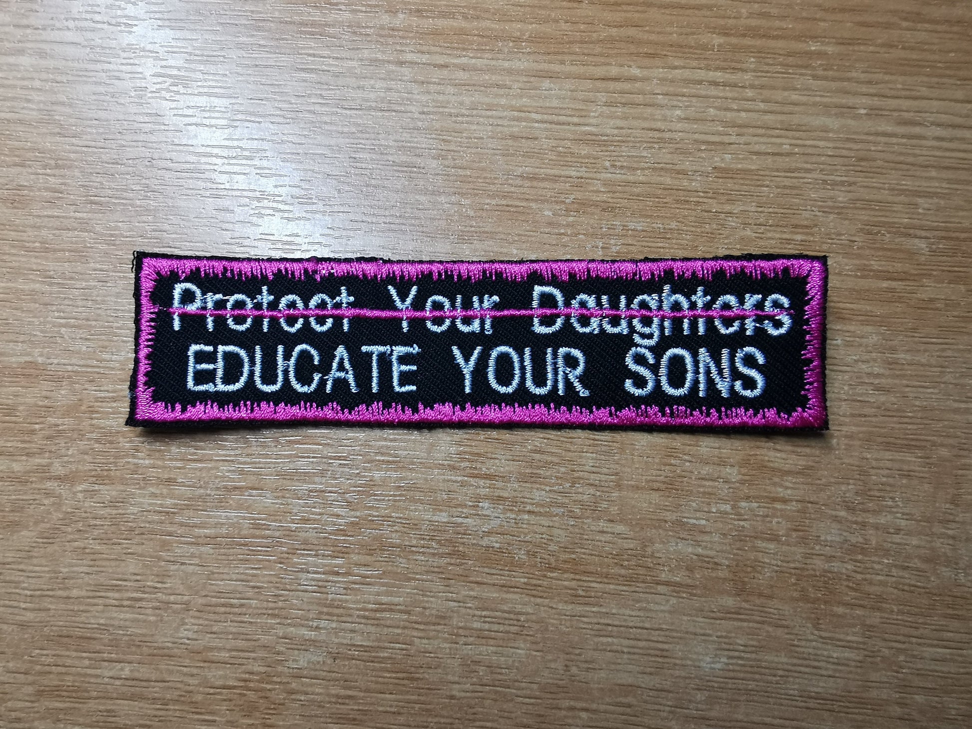 Embroidered Patch with "Educate your Sons" beneath the crossed out with a scrawled flamingo pink line, "protect your daughters". Surrounded by the same flamingo pink, in a fuzzy snow border, this patch speaks out against the misogynistic societal belief that women are solely responsible for their own safety, and that the blame does not lie at the feet of the patriarchy.