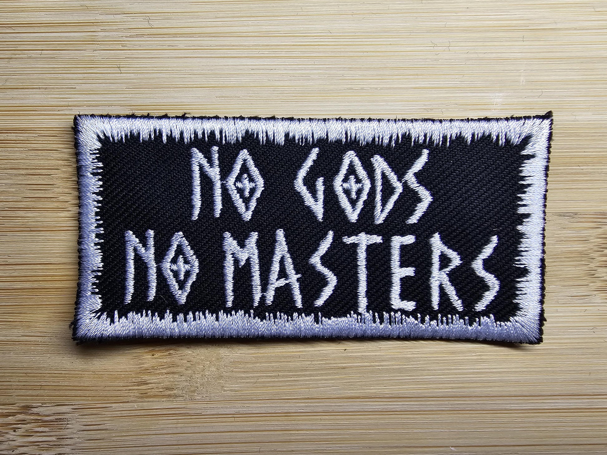 No Gods, No Masters embroidered patch with white text and a white spikey border.