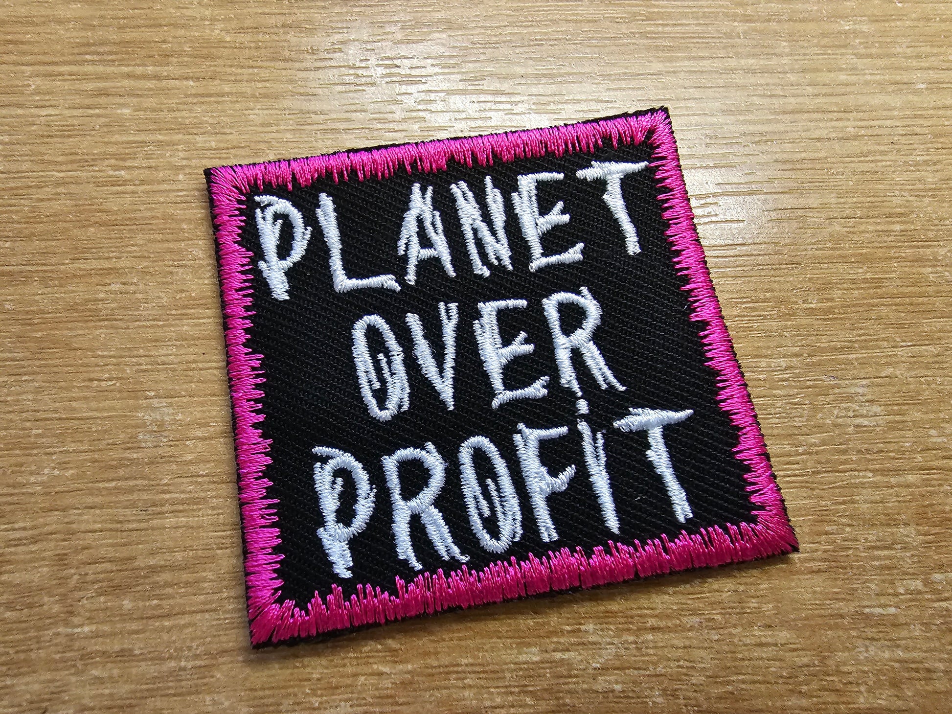 Planet over Profit political embroidery. White text surrounded by a striking Pink border.