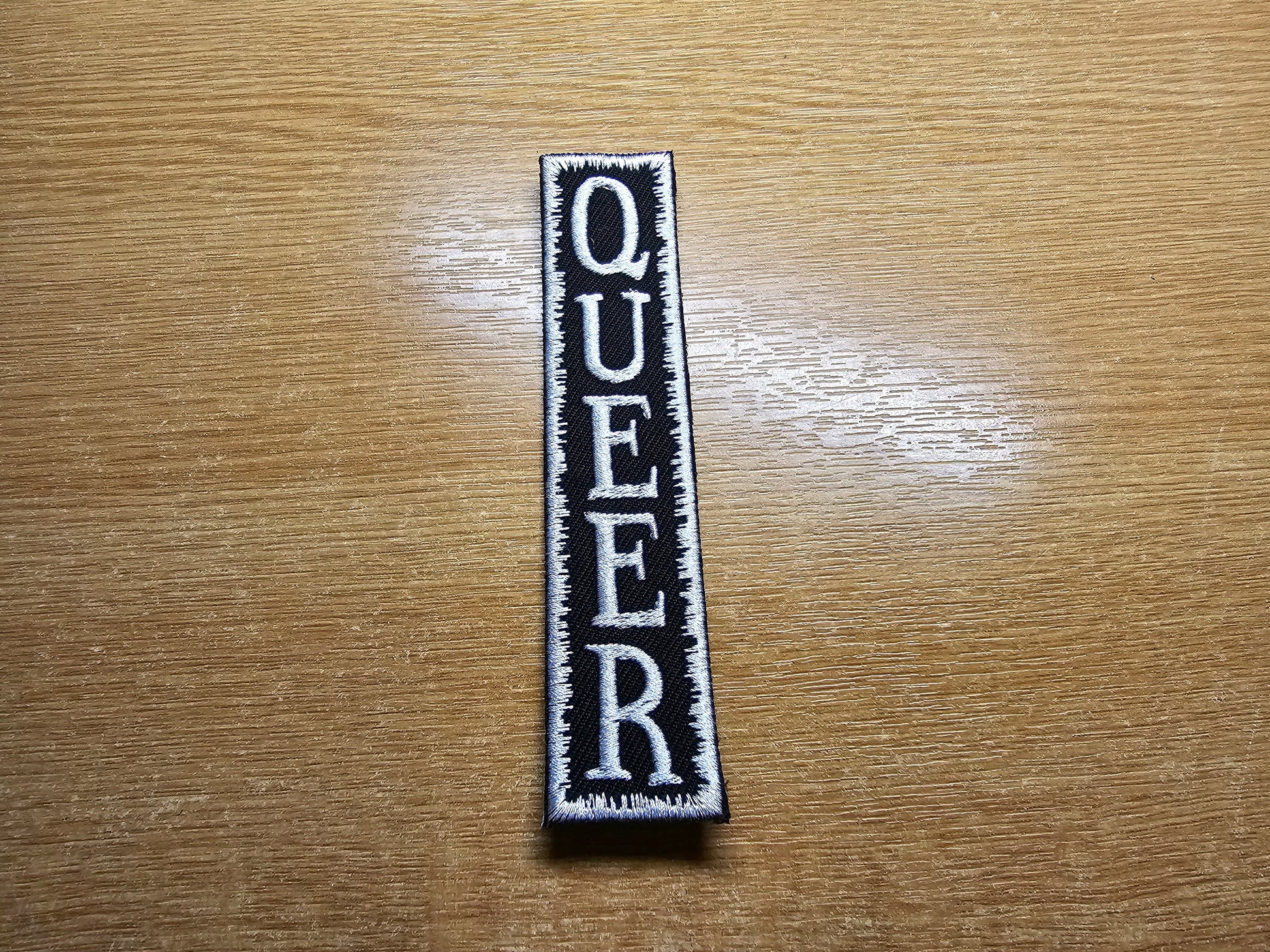 A Queer vertical embroidered patch in all white text and border with a fuzzy border, this patch will give you a perfect space filler for those vertical spaces left on your jackets that need to be filled.
