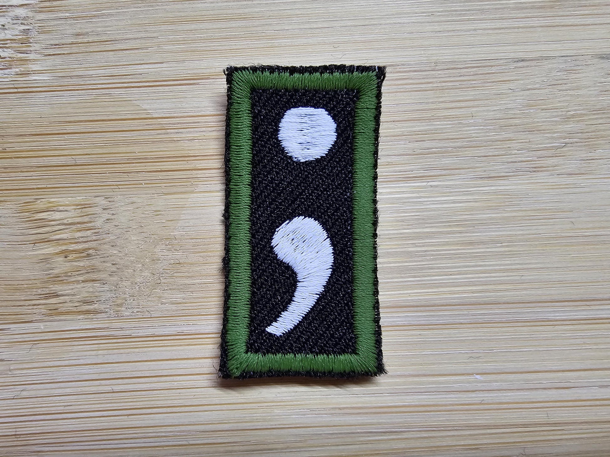 Semi Colon Patch, small white and blue mental health awareness patch.