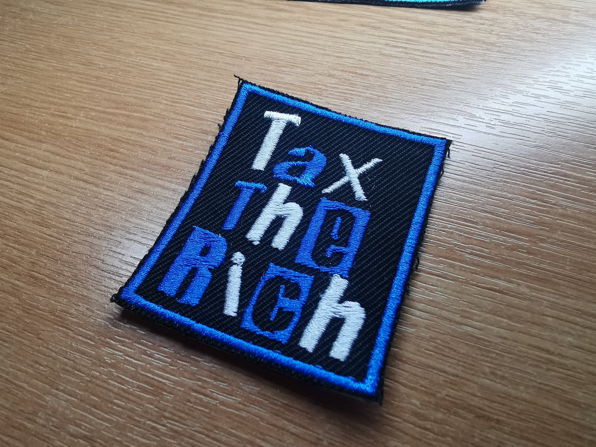 Tax The Rich Embroidered Iron On Patch Politics Punk Electric Blue.